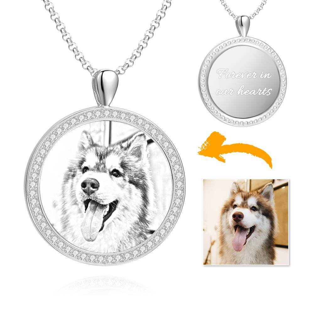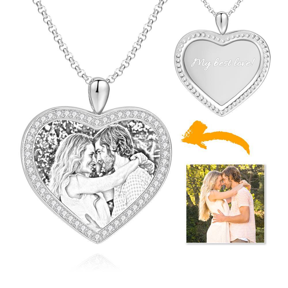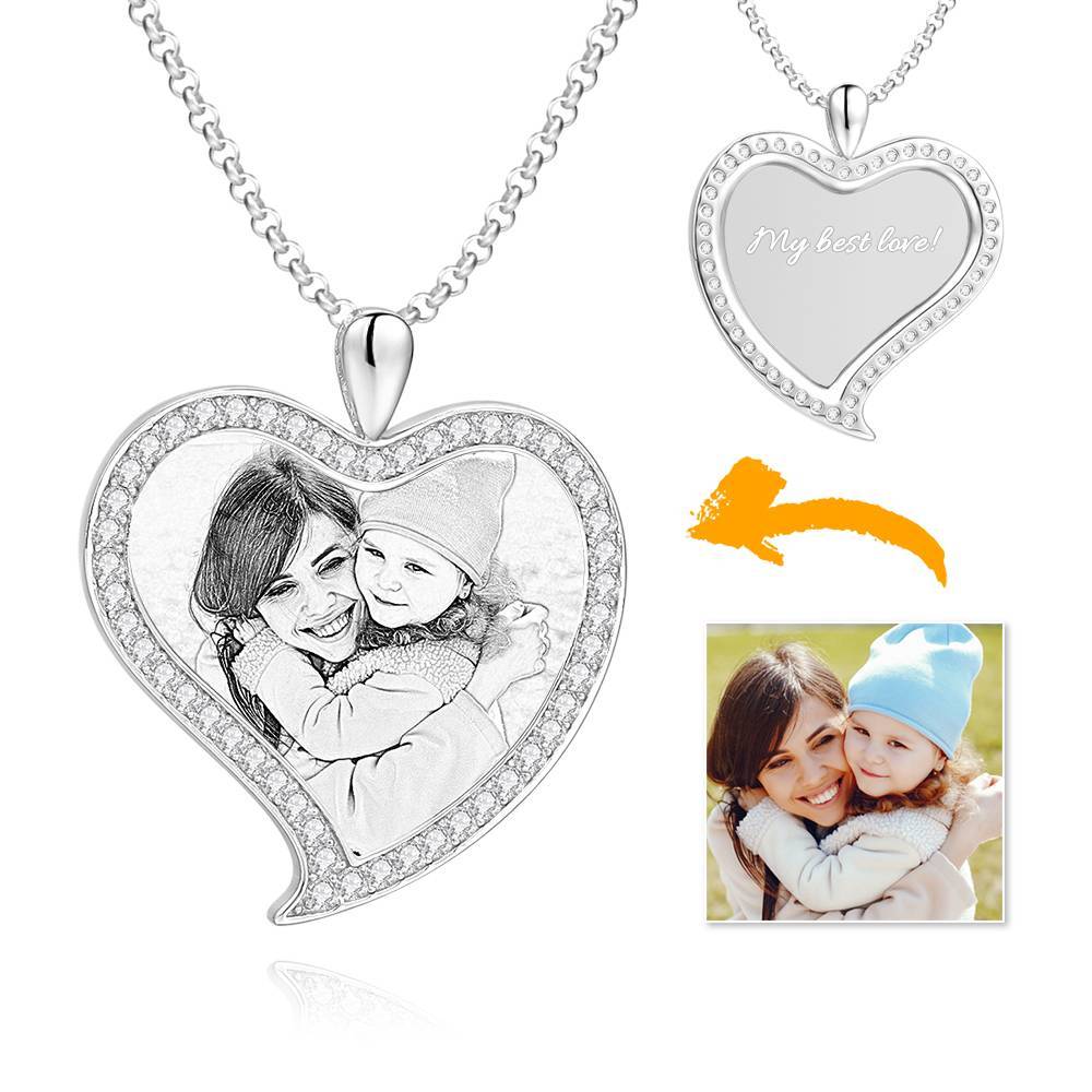56% DTO.Mujer Collar Grabable con Foto Personalizada, Collar con Foto de forma de Corazón de Amor con Cristal de Strass Plata Banada a Platino - Bosquejo -