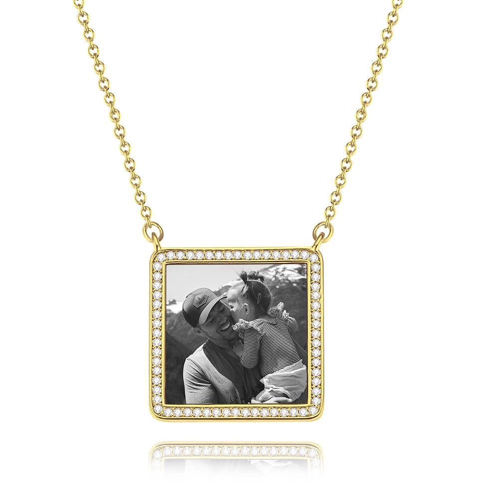 56% DTO.Collar Grabado con Foto Diamante de Imitación Cristal Forma Cuadrada Collar único Chapado en Oro 14K - Fotocopiado -