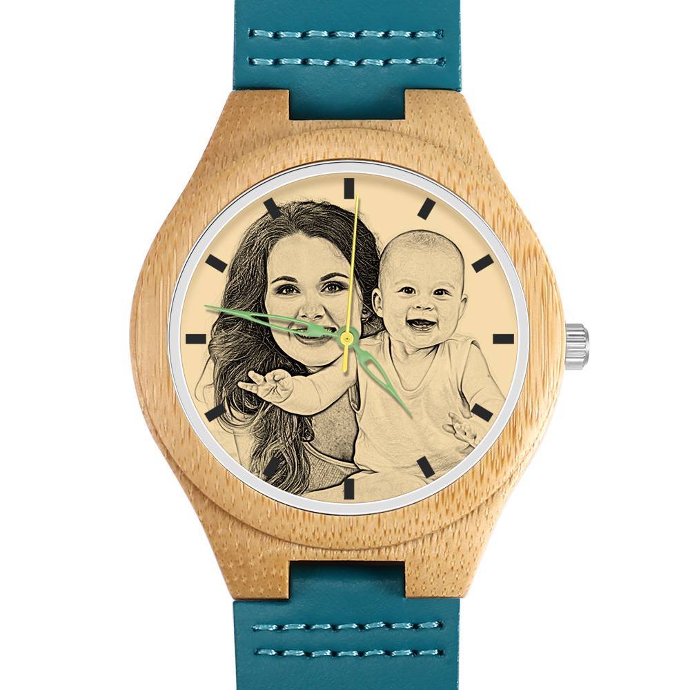 40% DTO.Mujer Reloj Grabable de Madera con Foto con Pulsera de Cuero Azul - Bambú -
