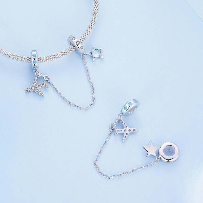 Cadena de dijes de seguridad con cielo estrellado de avión en plata