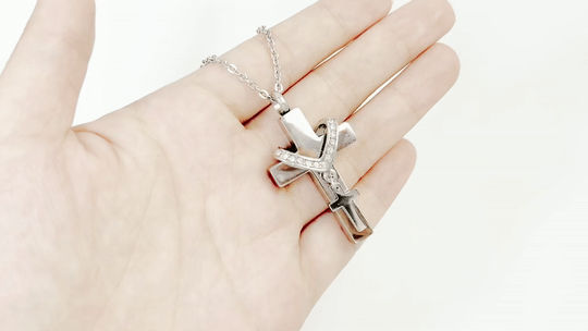 Mantén cerca a tu ser querido con este elegante collar, que guarda discretamente una pequeña porción de cenizas o agua bendita. Su diseño atemporal y duradero lo convierte en un hermoso tributo que puedes llevar a diario.