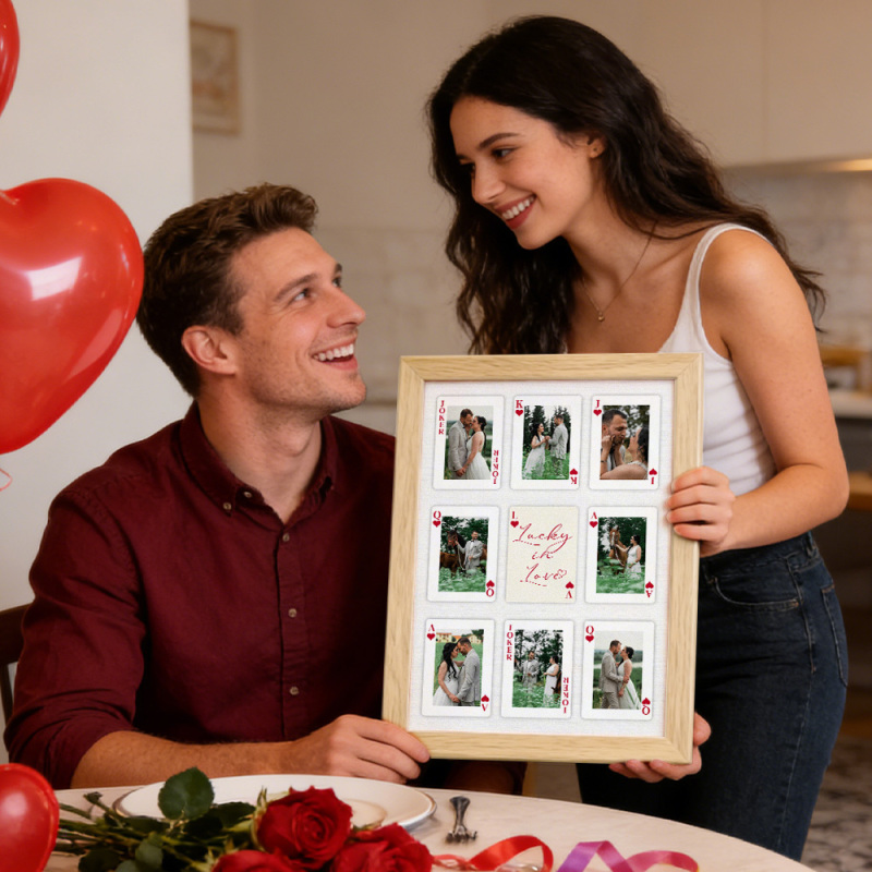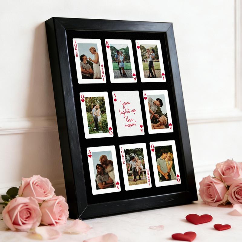 Convierte tu historia de amor en una obra de arte. Este Marco de Naipes Personalizado transforma tus recuerdos favoritos en un diseño romántico inspirado en naipes, combinando arte mural moderno con una personalización significativa. Inspirado en la estética viral del póster de amor 'Qué Suertes Tenemos', es más que un regalo: es un recordatorio visual de conexión, suerte y momentos compartidos.