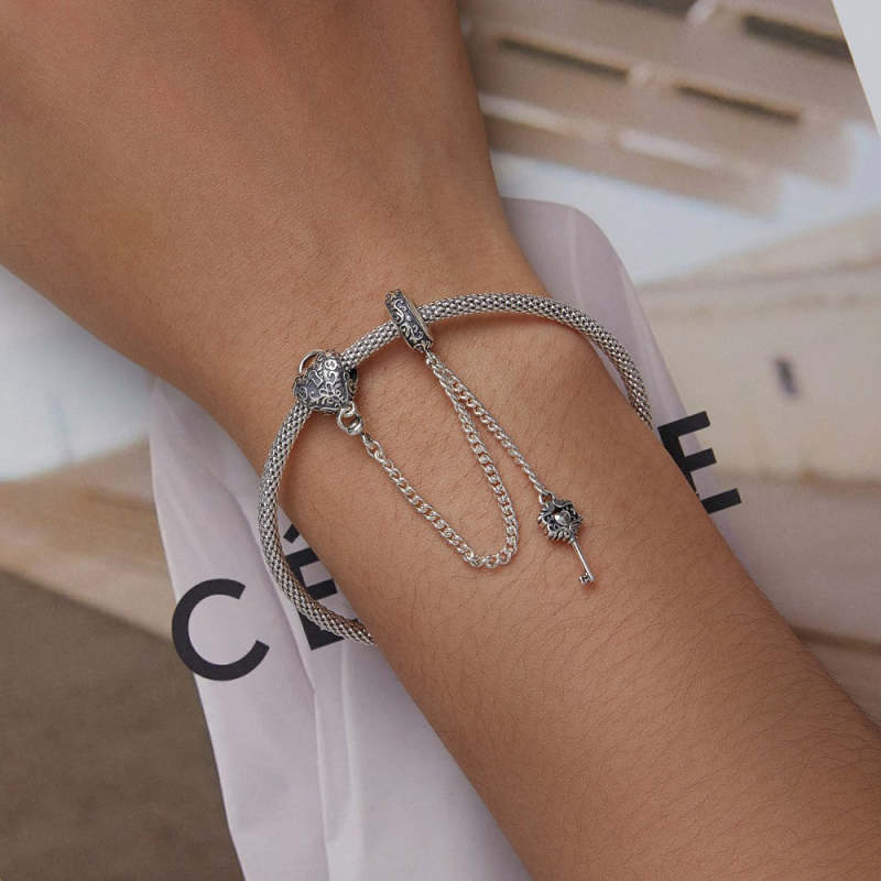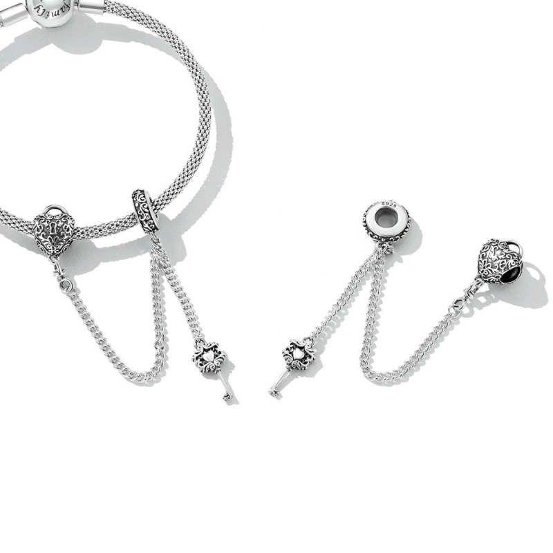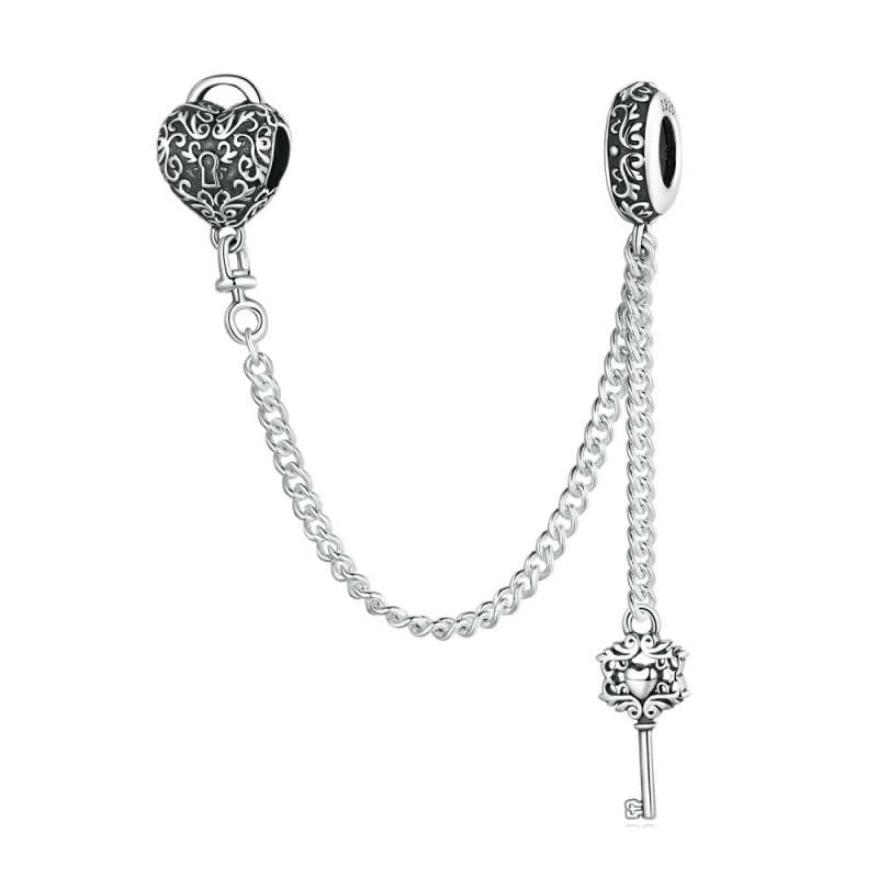 Cadena con dije de seguridad con llave y candado en forma de corazón en plata