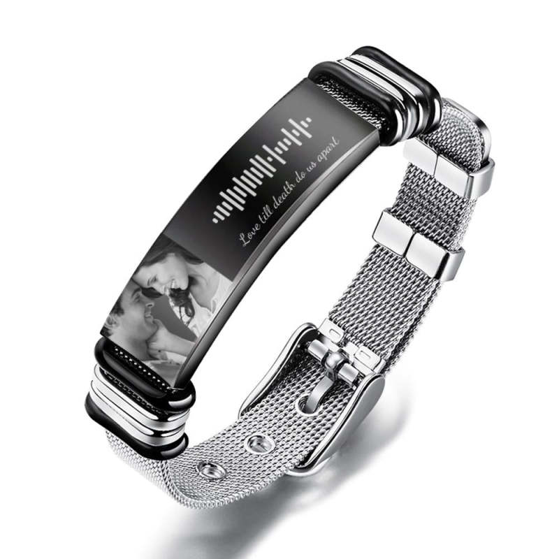 Este brazalete único es el mejor regalo perfecto para él. Hecho de acero inoxidable, como si su amor por él pudiera durar para siempre. Personalice el brazalete con el código de música, con una foto y palabras grabadas, elija su canción, foto y palabras favoritas, todo se puede imprimir en el brazalete, y puede generar un código de música único. Puede escanear el código en la aplicación Música, después de escanear el código, su canción comenzará a reproducirse inmediatamente. Es un regalo perfecto para el aniversario de una pareja, para el día de San Valentín, regalo para el día de la boda.,y varias ocasiones.