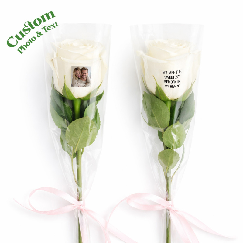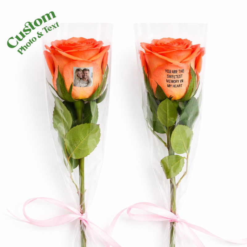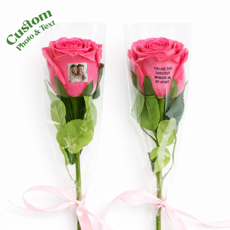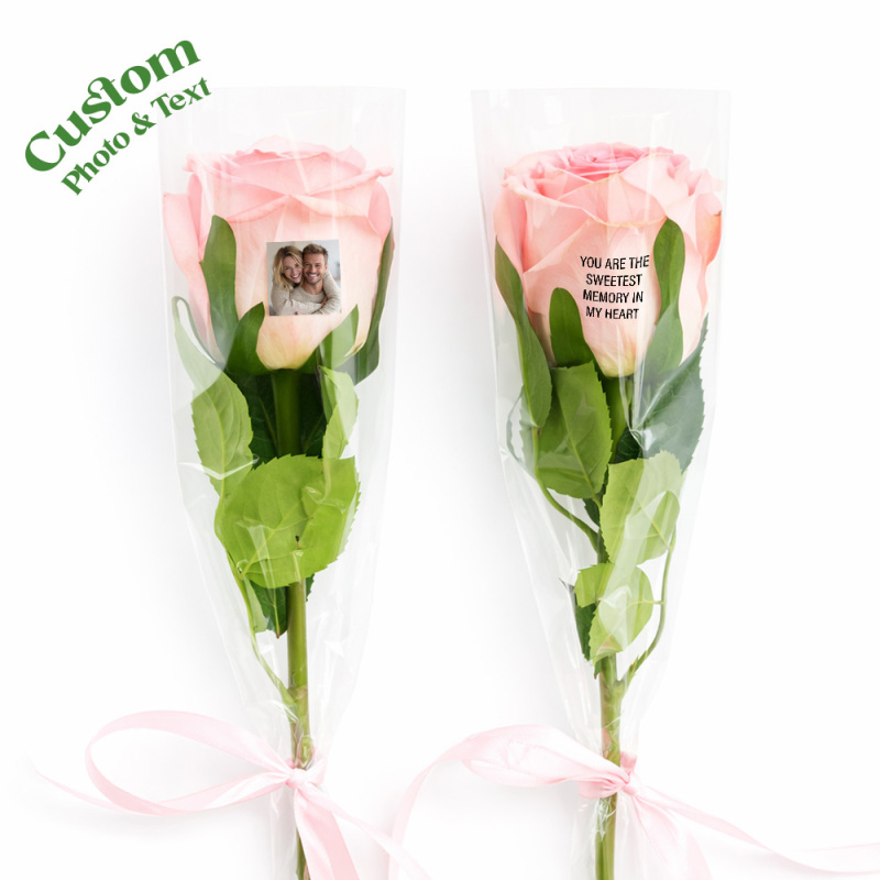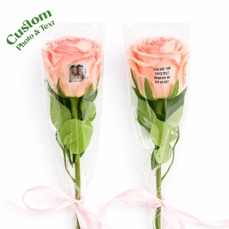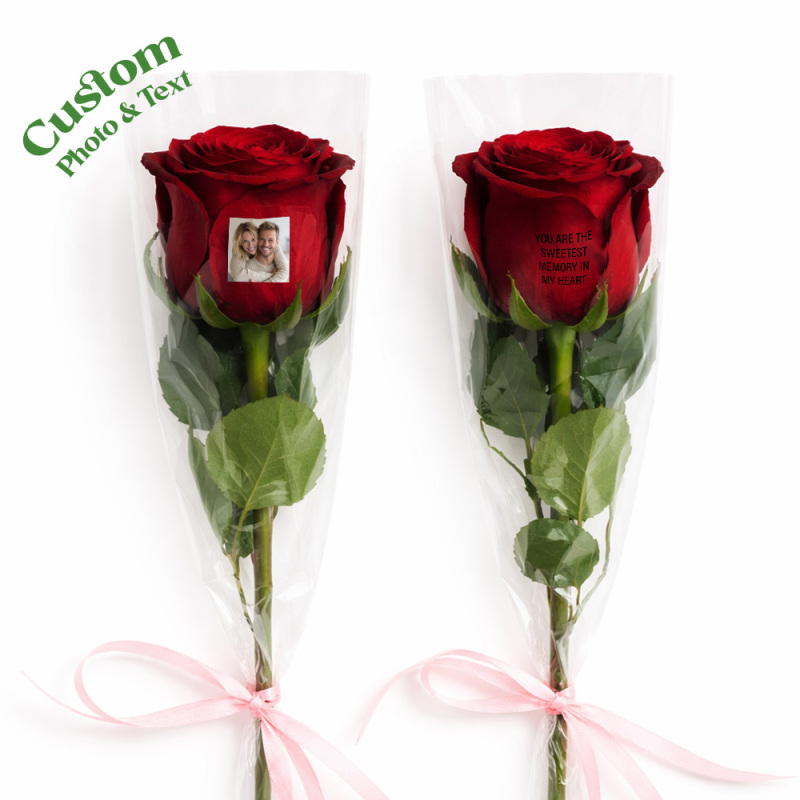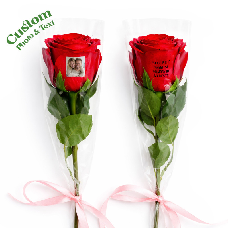 Rosas con foto: Nuestras rosas te permiten añadir no solo una foto de tu ser querido, sino también un mensaje personal, añadiendo un toque de cariño al regalo, haciéndolo verdaderamente único y memorable.