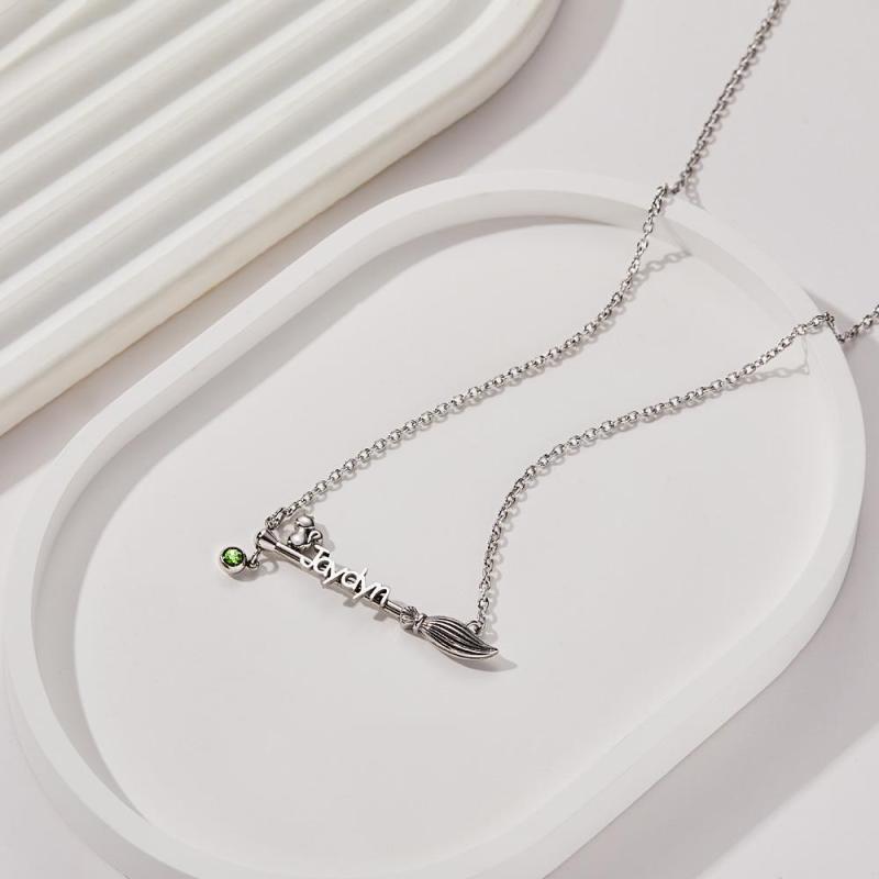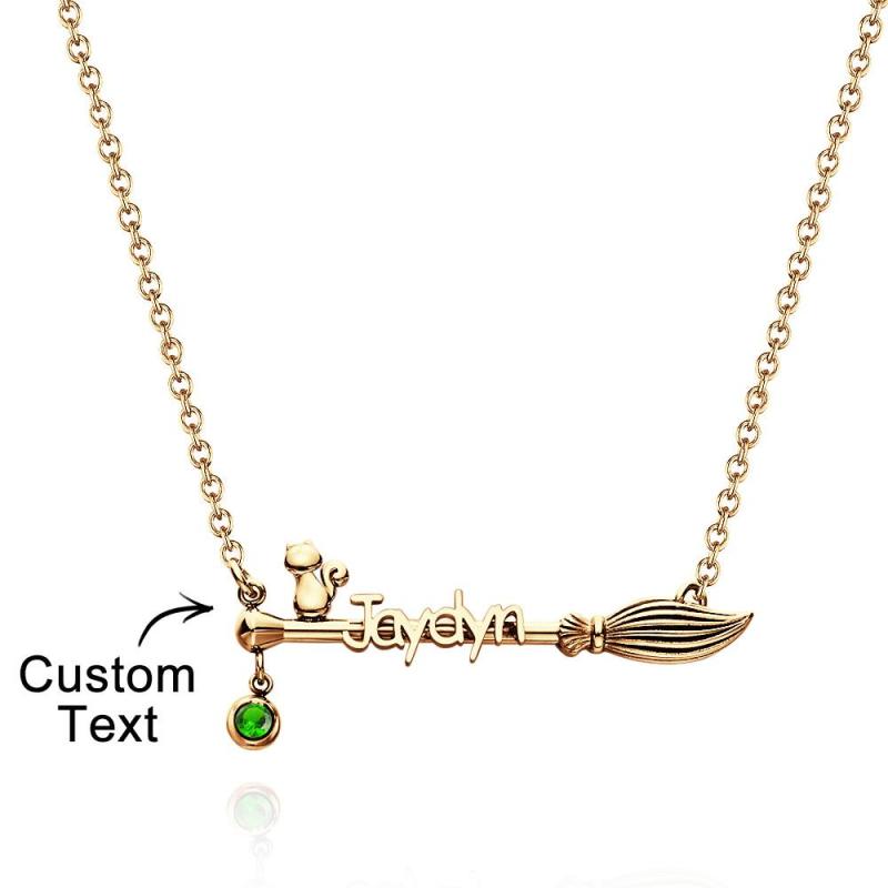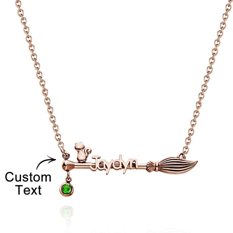 Agregue más diversión a sus vacaciones de Halloween con nuestro collar de escoba personalizado. Este collar tiene un colgante de escoba con un gato. Pronto te llevará a la atmósfera festiva de un festival maravilloso y misterioso. Personaliza un collar de escoba con tu nombre y piedra de nacimiento para convertirlo en una pieza de joyería única y agregar un toque especial a tu look navideño.