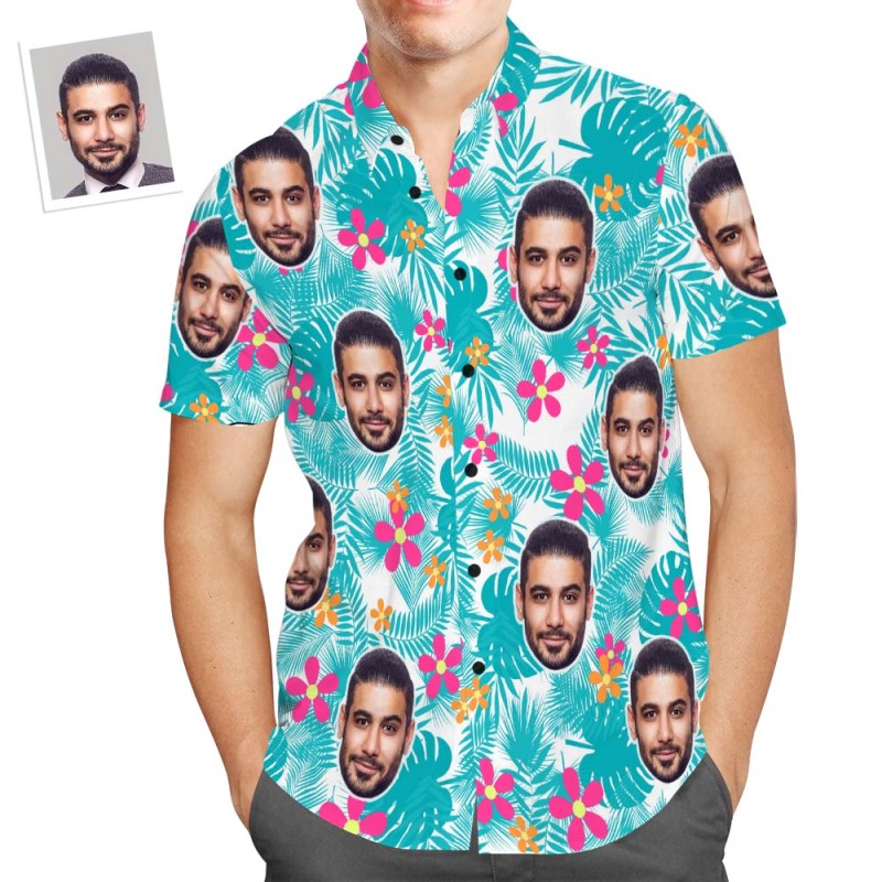 Camisa Hawaiana Aloha Con Estampado Completo Para Hombre Con Cara Personalizada, Lindas Flores Y Hojas