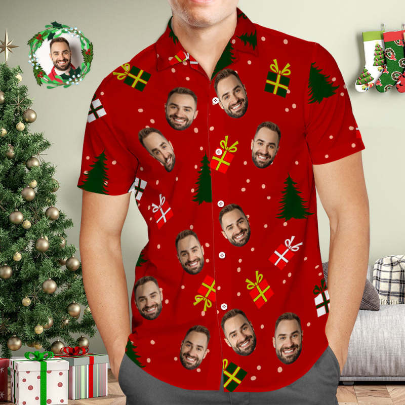 Camisa Hawaiana Personalizada Para Hombre Con Foto Personalizada Camisas Hawaianas Rojas Árbol De Navidad Y Regalos Feliz Navidad