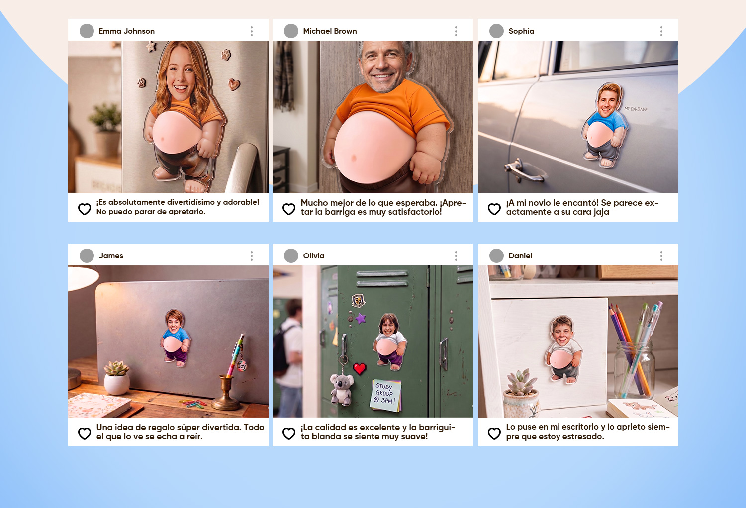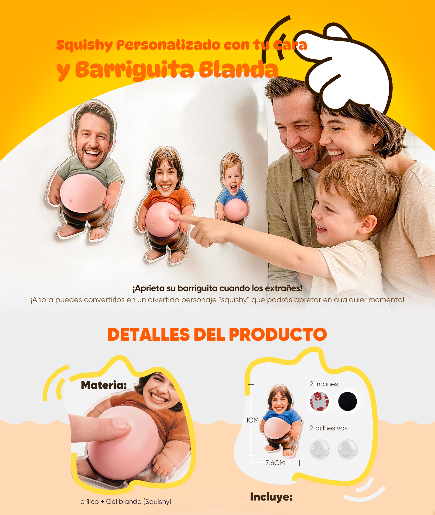 ¿Y si tu persona favorita pudiera convertirse en una pequeña pegatina blandita que puedes apretar cuando quieras?Estas pegatinas personalizadas para coche con forma de cara y barriga blandita te permiten subir una foto, recortar la cara y convertirla en un adorable personaje con una barriga suave y apretable.Características principales Diseño de cara personalizado