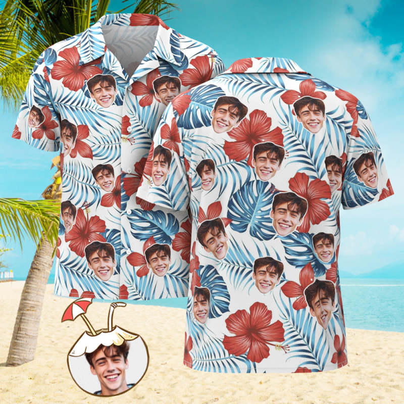 Camisa De Hombre Personalizada Con Estampado De Cara, Camisa Hawaiana, Hibisco Blanco