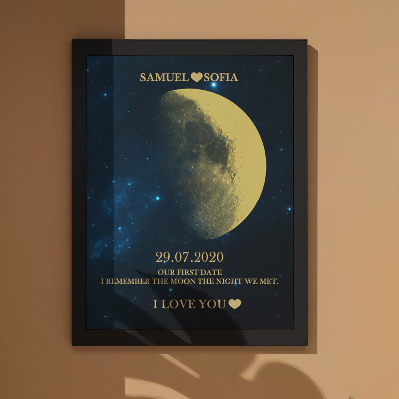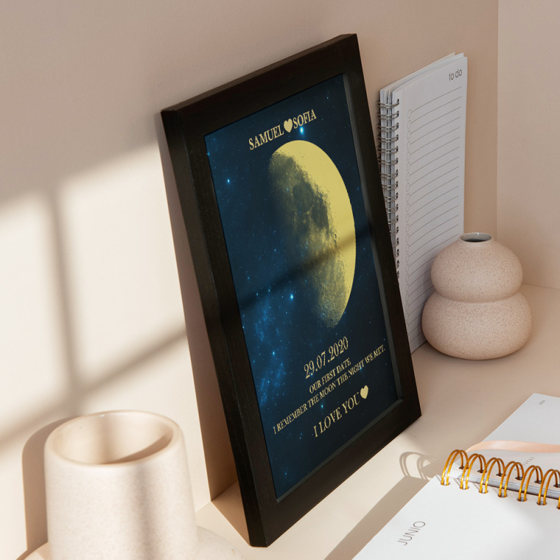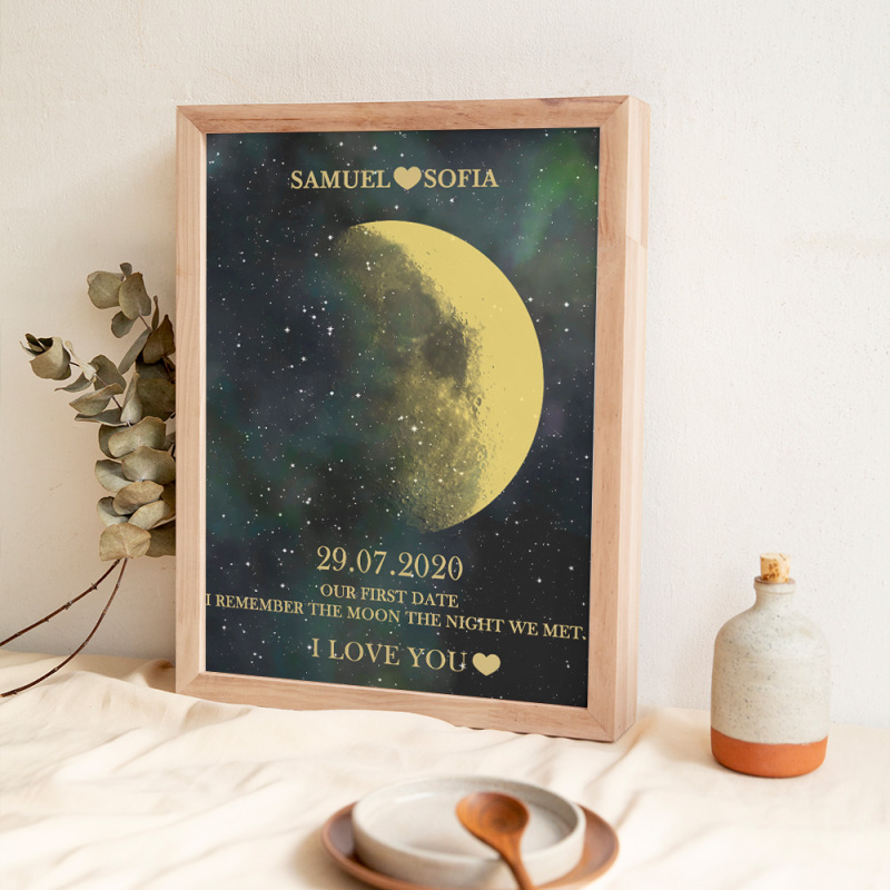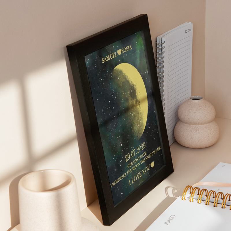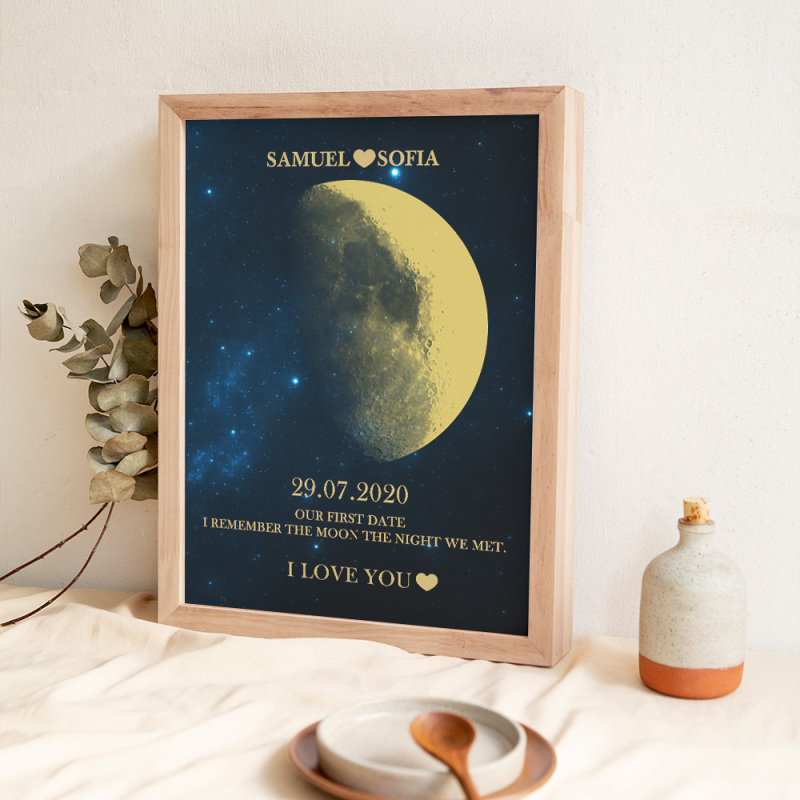 En cada momento extraordinario, utilizamos las eternas fases de la luna para conmemorar esos momentos conmovedores. Celebre su amor con un obsequio atento y personalizado, creando recuerdos únicos y preciados para esa noche especial. Nuestro marco de madera con estampado de noche de luna muestra la fase lunar precisa desde la noche en que te conociste o el día en que naciste, lo que lo convierte en un regalo verdaderamente excepcional y emocionalmente rico.