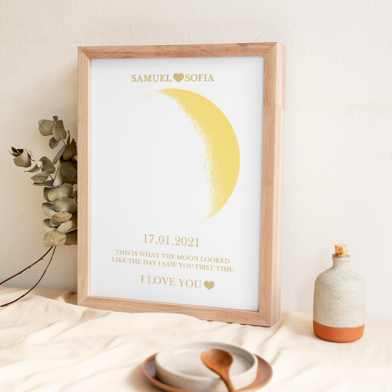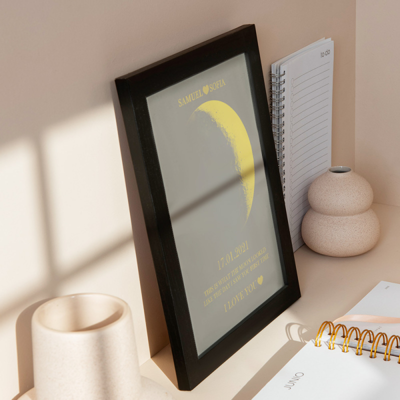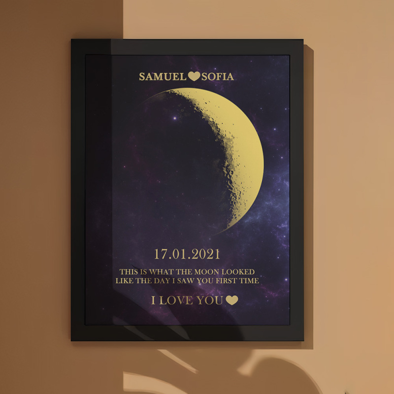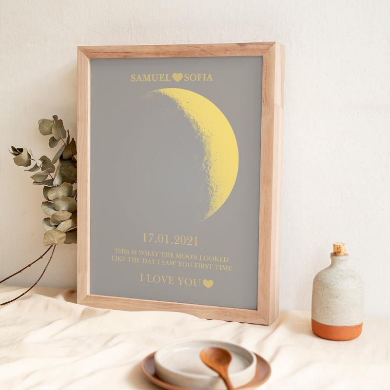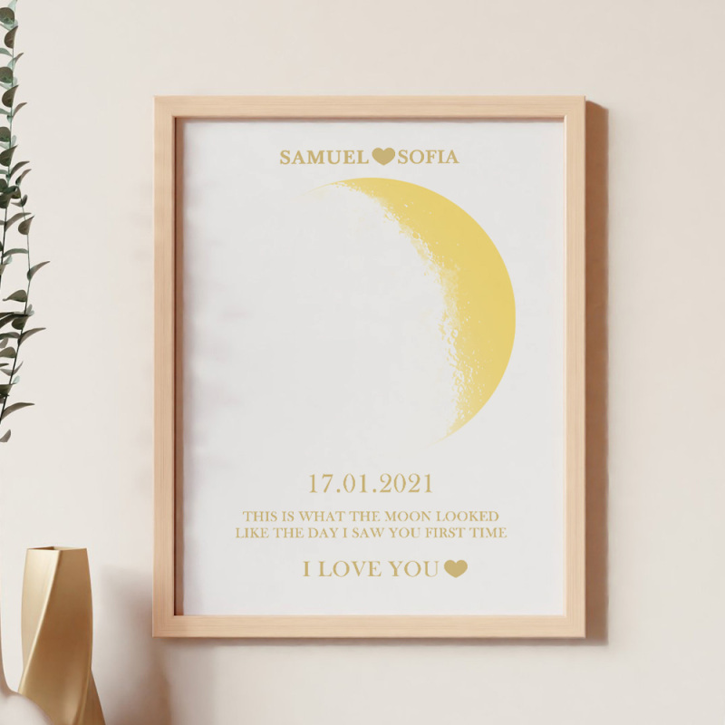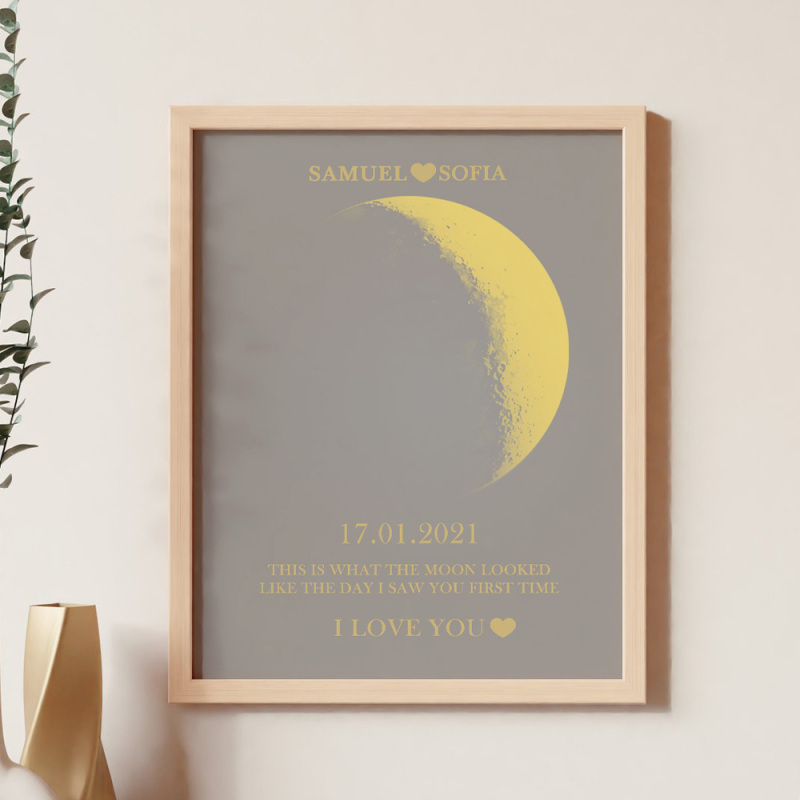 En cada momento extraordinario, utilizamos las eternas fases de la luna para conmemorar esos momentos conmovedores. Celebre su amor con un obsequio atento y personalizado, creando recuerdos únicos y preciados para esa noche especial. Nuestro marco de madera con estampado de noche de luna muestra la fase lunar precisa desde la noche en que te conociste o el día en que naciste, lo que lo convierte en un regalo verdaderamente excepcional y emocionalmente rico.