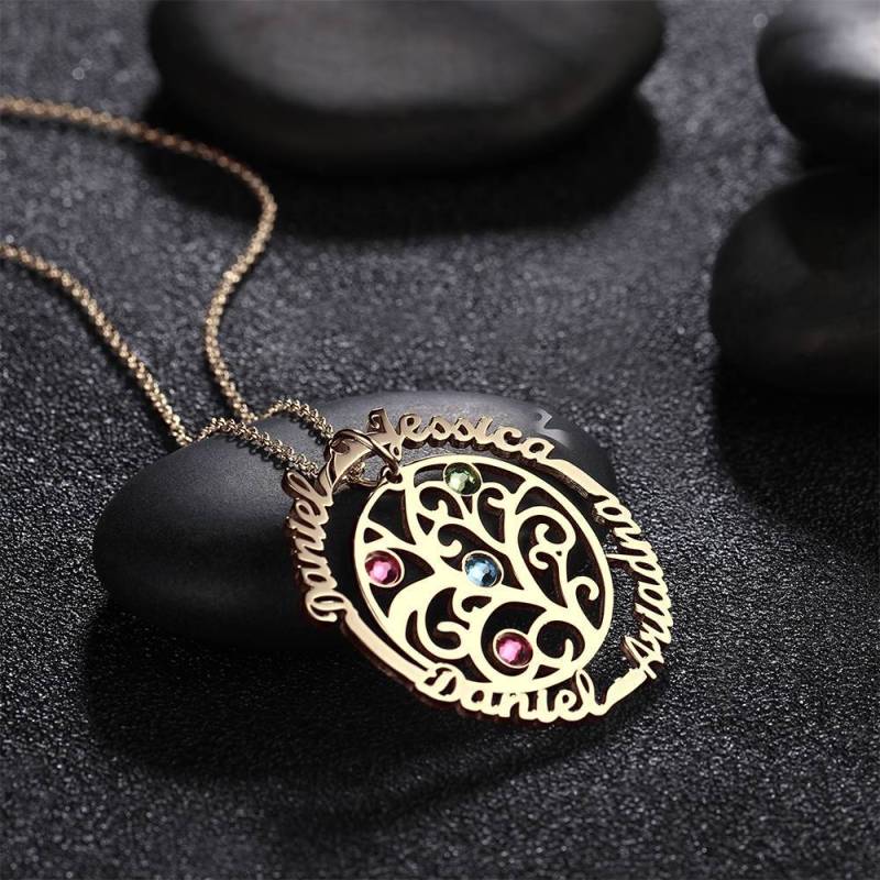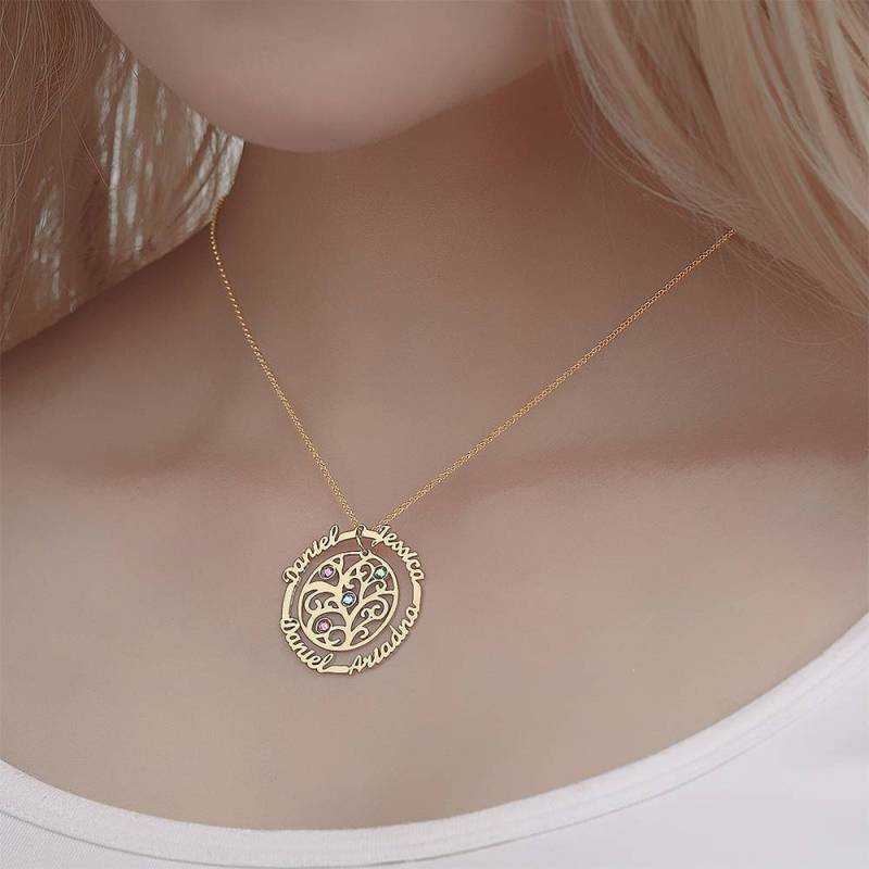 Personalizado Nombre Collar con Piedra de Nacimiento, árbol Familia Collar Chapado en Oro de 14K - Plata