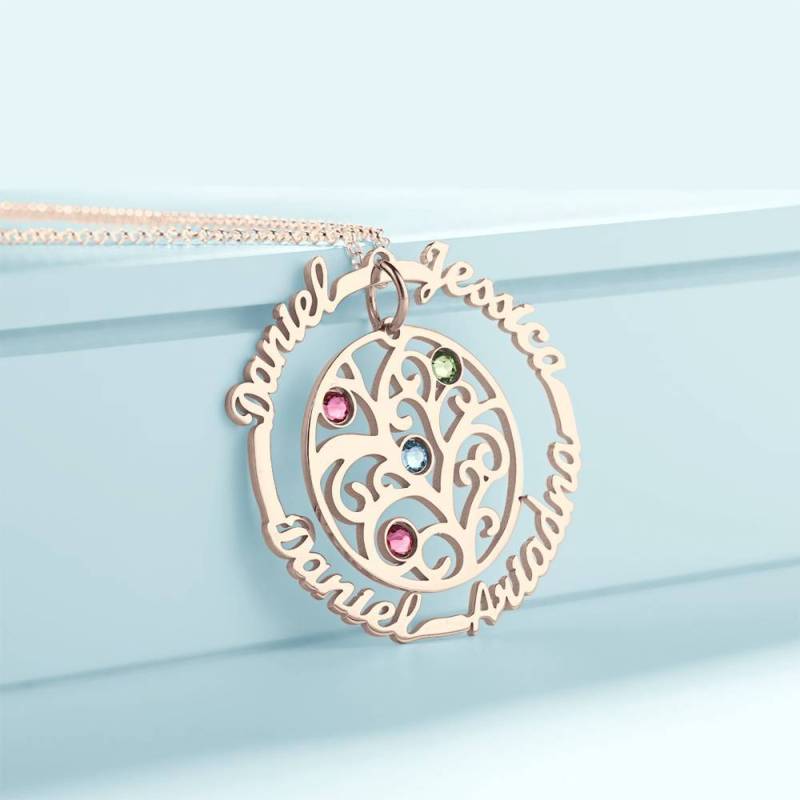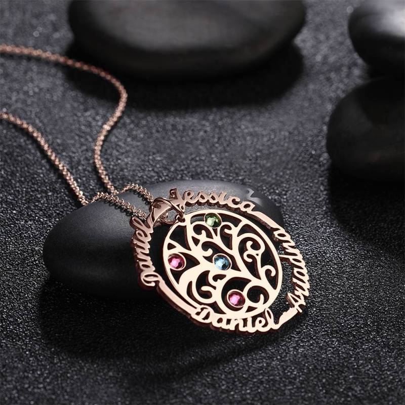 Personalizado Nombre Collar con Piedra de Nacimiento, árbol Familia Collar Chapado en Oro Rosa - Plata