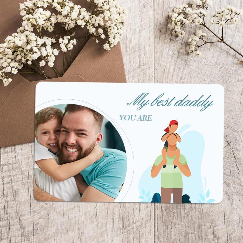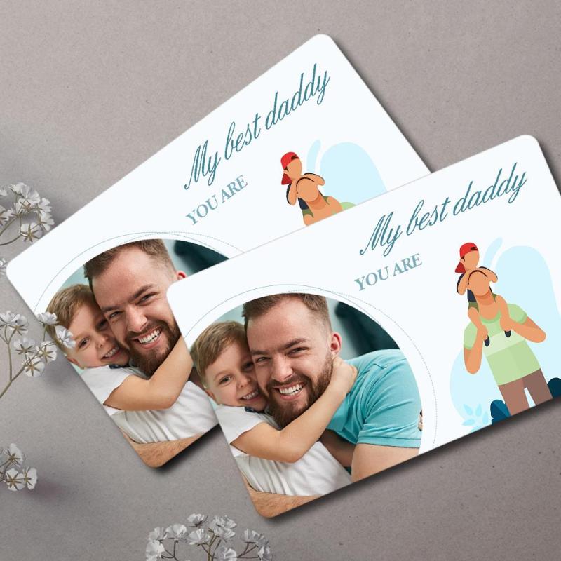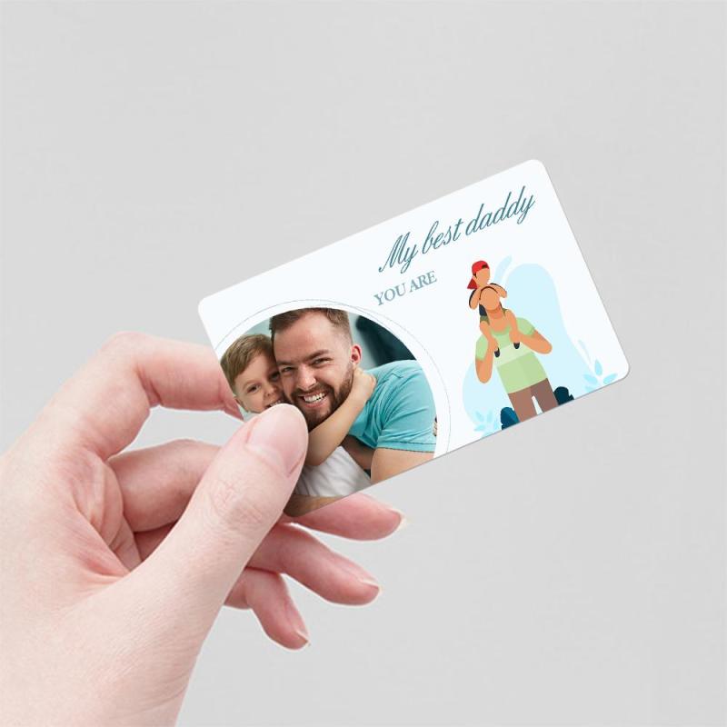 ¡Una tarjeta perfecta para el Día del Padre! Personalízalo con tu foto favorita y crea un hermoso y único regalo para papá que pueden insertar en la billetera y guardarlo para siempre. Incrustamos la imagen de forma permanente con una tinta UV que no se despega ni se raya. Las tarjetas de inserción son livianas y caben muy bien en su billetera.