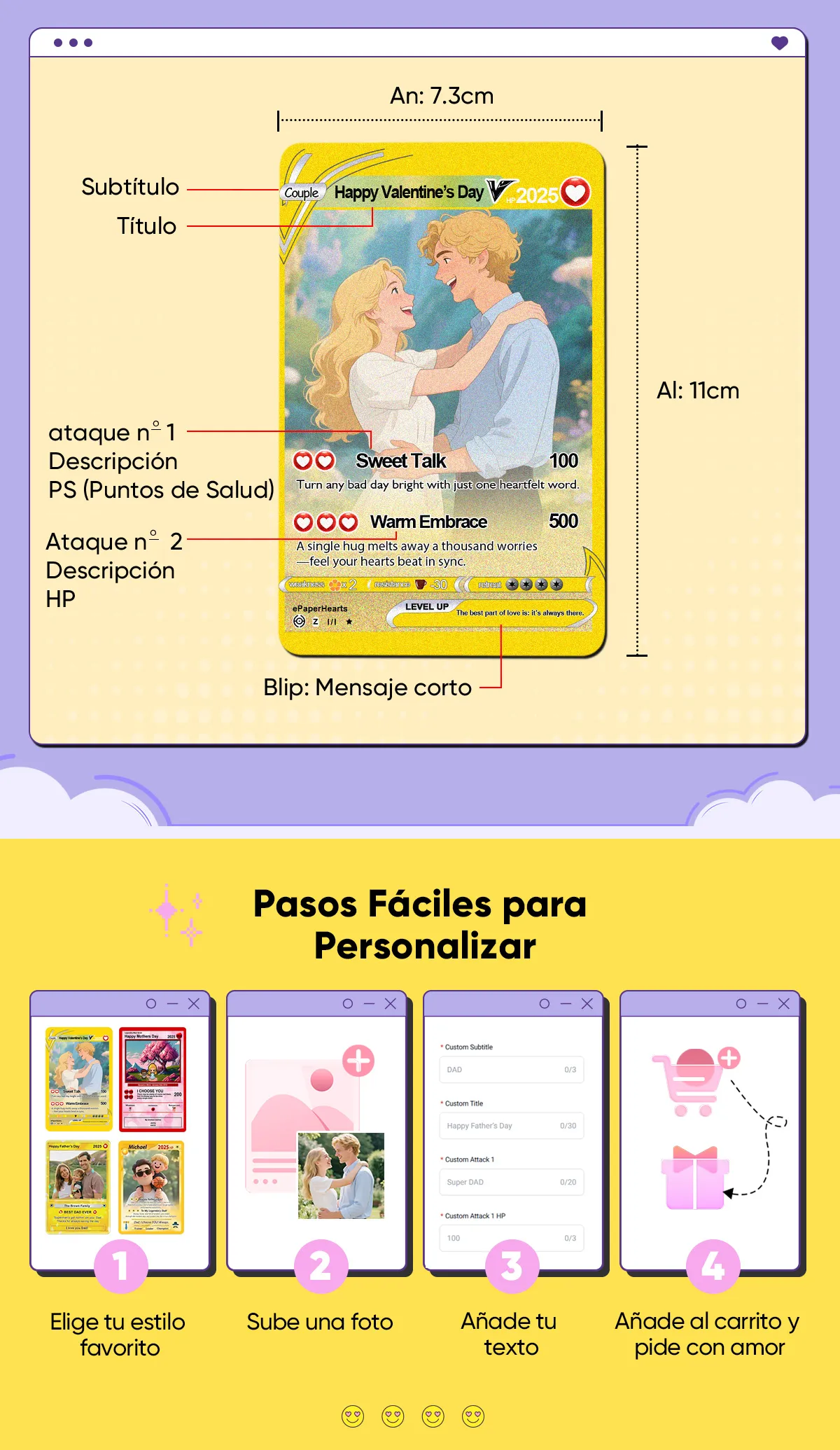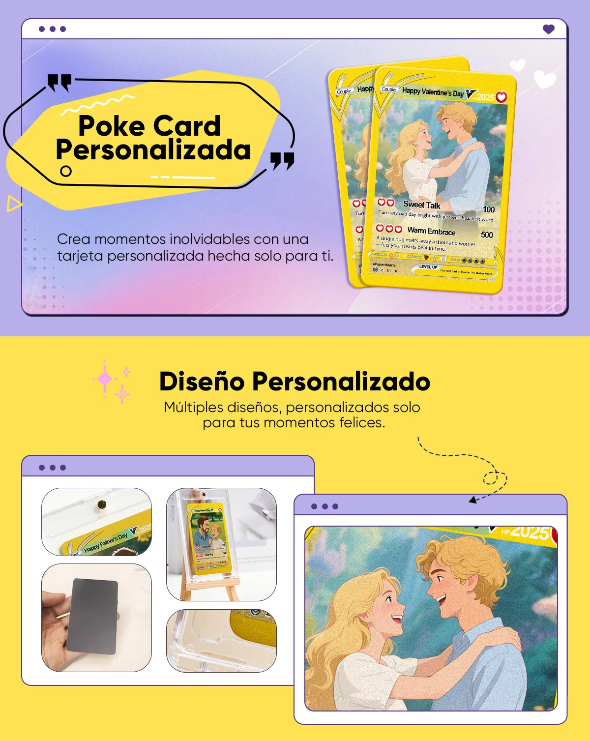 Deléitalo con una Poke Card personalizada, con un vibrante diseño de dibujos animados y alojada en un estuche acrílico de primera calidad. Este regalo de aniversario único combina una divertida nostalgia con una calidad duradera, lo que lo convierte en un regalo memorable para cualquier entusiasta del poke.