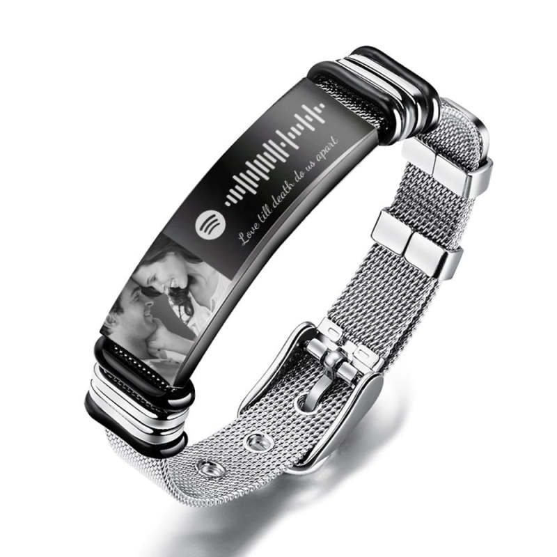 Este brazalete único es el mejor regalo perfecto para él. Hecho de acero inoxidable, como si tu amor por él pudiera durar para siempre. Personaliza el brazalete con el código de Spotify, con una foto y palabras grabadas, elige tu canción, foto y palabras favoritas, todo se puede imprimir en el brazalete, y puede generar un código de Spotify único. Puede escanear el código en la aplicación de Spotify, después de escanear el código en Spotify, su canción comenzará a reproducirse inmediatamente. Es un regalo perfecto para el aniversario de una pareja, para el día de San Valentín, una boda Regalo de día y varias ocasiones.