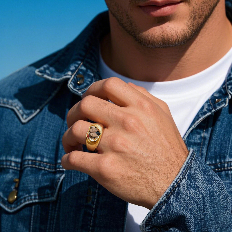 Hecho de acero inoxidable resistente, de muy alta calidad y larga retención de color, además de hipoalergénico. No se oxida, se decolora ni se empaña fácilmente. Nuestro anillo personalizado con foto no contiene níquel, plomo ni cadmio, es seguro para pieles sensibles.