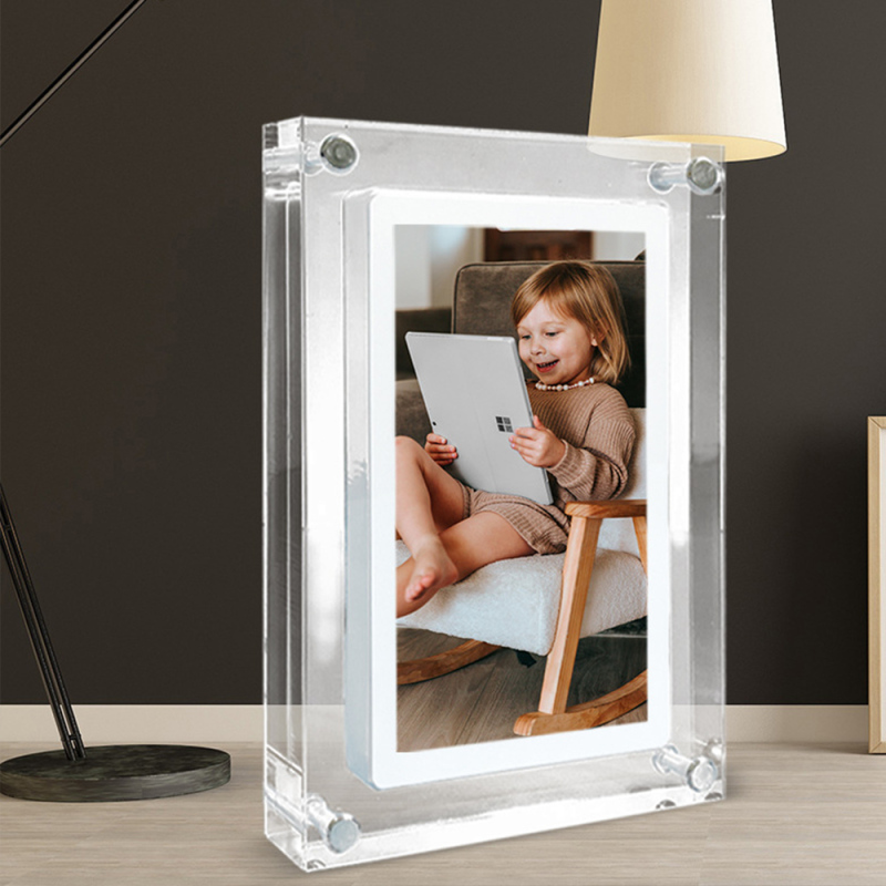 Presentamos nuestro elegante y moderno marco de fotos digital acrílico. Puede reproducir vídeos y fotos. Conéctese a la computadora para cargar imágenes o videos. Simplemente colóquelo en el disco extraíble (el formato debe ser compatible con este producto). Puede ayudar a evitar que las personas agreguen o eliminen. El producto incluye un marco de fotos acrílico, un manual de instrucciones, un Cable USB y enchufe para cargador.