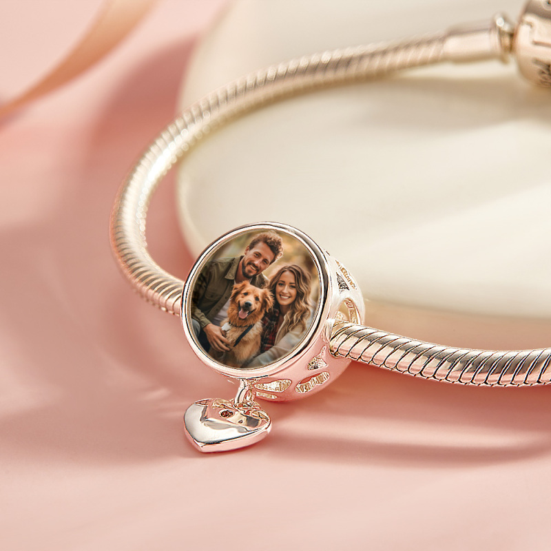 Aprecia el mejor momento de la familia con este colgante con foto grabable con huella de mascota, pata y amor. esta pieza tiene un adorable colgante de corazón. Puedes cargar una foto y la superficie lisa en la parte posterior del corazón también podría grabar el nombre o la fecha que deseas para crear una pieza de joyería única. Una adición significativa a tu pulsera.