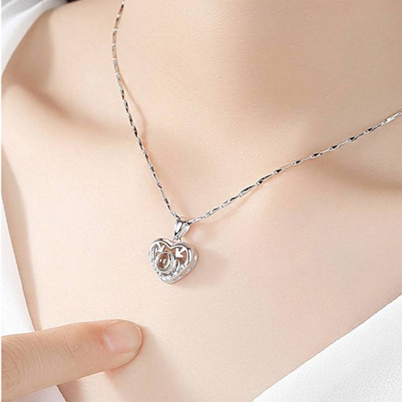 Te Amo Collar en 100 Idiomas Collar en Forma Corazón con Astas de Proyección con Foto Grabada Plata