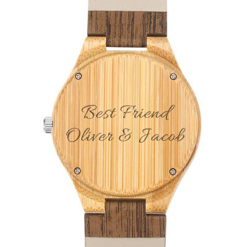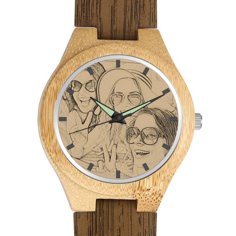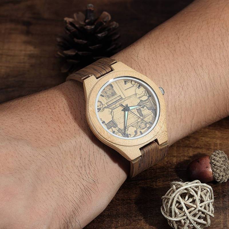 Hombre Grabable Bambú Reloj de Foto Correa de Cuero de Color Madera 45mm