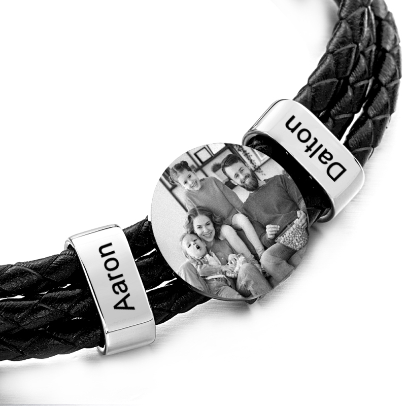 Este regalo personalizado para el Día del Padre es verdaderamente único. Elaborada con acero inoxidable y cuero genuino, la pulsera de cuero con foto para hombre presenta un apellido personalizado para un regalo único y significativo. Una combinación perfecta de estilo y sentimiento, este artículo hecho a mano alegrará el día de papá.