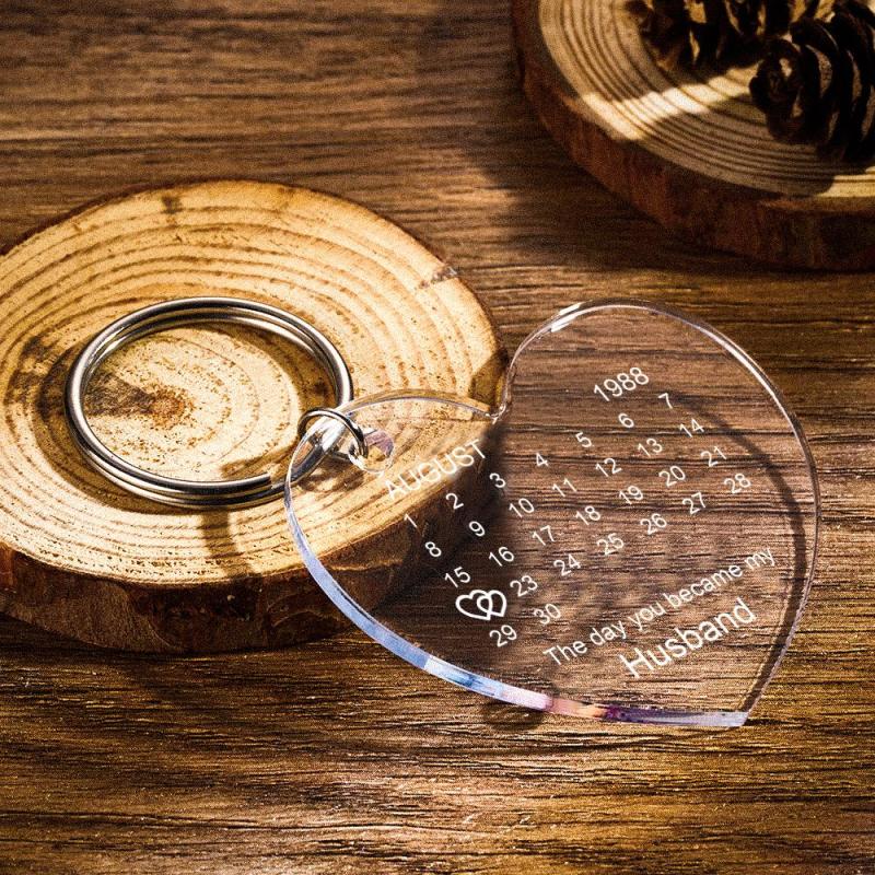 Llaveros con calendario personalizados. Grabados con El día en que te convertiste en mi esposo o cualquier cosa. La fecha reemplazada con un corazón doble. Este exclusivo llavero acrílico es el mejor regalo para él/ella en el aniversario. Llavero calendario para fecha autoseleccionada, puedes grabar tu relación con él en la placa acrílica, puedes generar una fecha única.