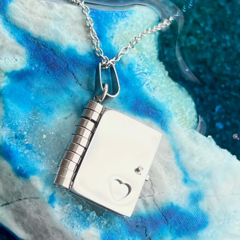 Collar con medallón de libro pequeño de plata personalizado, collar con colgante y mensaje, regalo de recuerdo para dama de honor, regalo de recuerdo para ella. Este collar con medallón de libro de acero inoxidable 316L, ecológico, sostenible y de primera calidad tiene 3 páginas interiores encuadernadas de estilo vintage con 6 lados disponibles para grabar, así como en la cubierta frontal/interior del relicario.