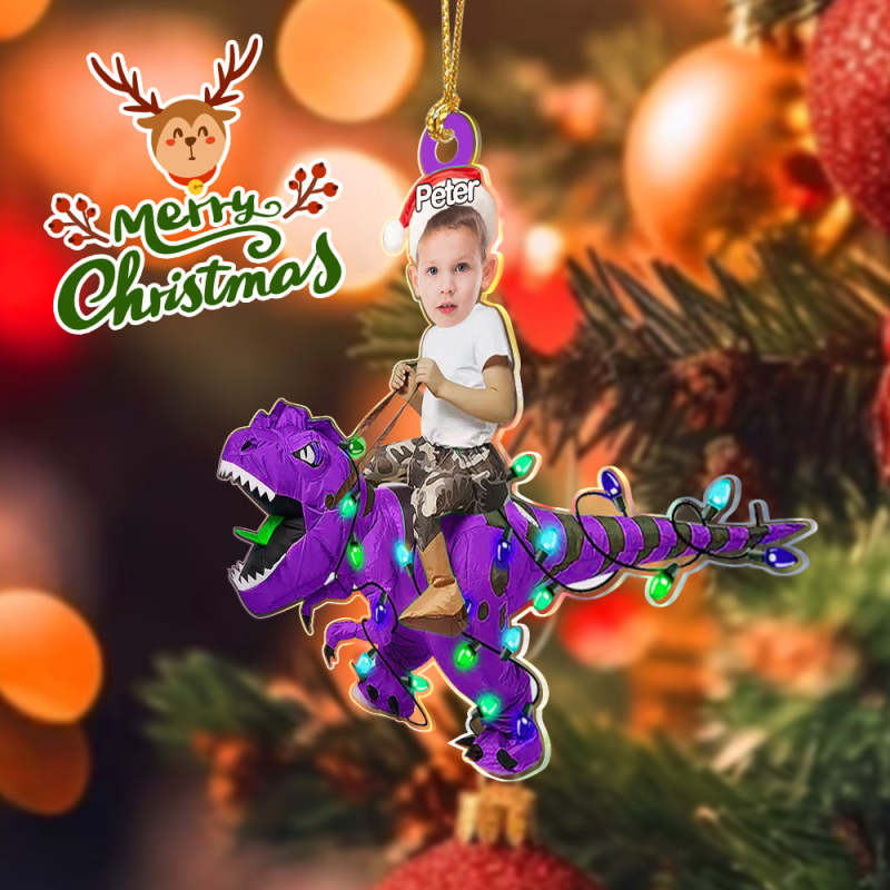 Añade un toque personalizado a tus decoraciones navideñas con este lindo niño montando un adorno de dinosaurio. Con el nombre de su hijo, es el regalo perfecto para cualquier joven amante de los dinosaurios. Este adorno seguramente se convertirá en un preciado recuerdo en los años venideros.