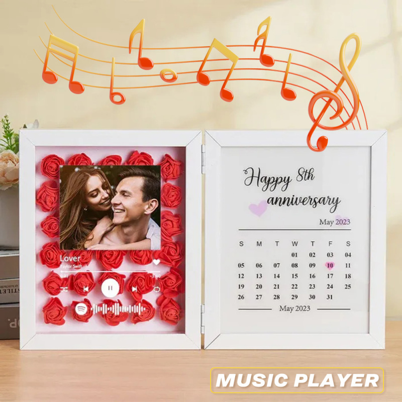 Cada caja de sombras presenta un exquisito ramo de flores de papel hechas a mano, arregladas con delicados detalles. Debajo, un sutil calendario de aniversario marca su camino juntos. Selecciona una canción significativa y la integraremos con un reproductor de música de un solo toque: deja que la melodía dé vida a tus recuerdos con solo presionar un botón.