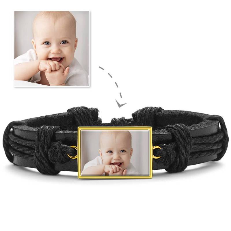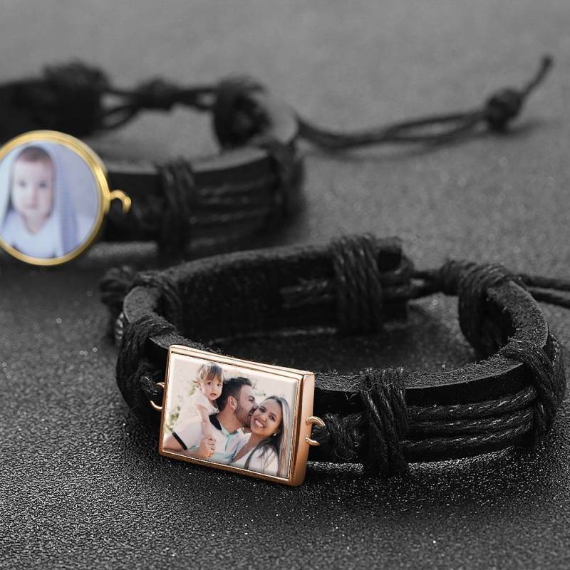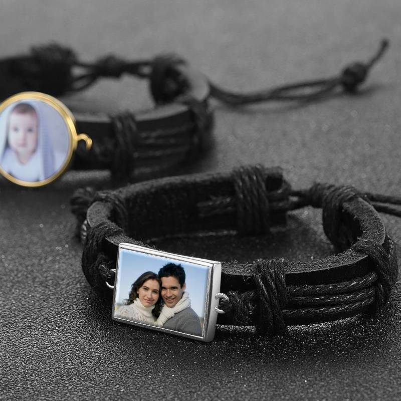 Pulsera con Foto, Regalo de Recuerdo, Cuero Negro, En Forma de Cuadrado, Plateado, Plateado, Colorido