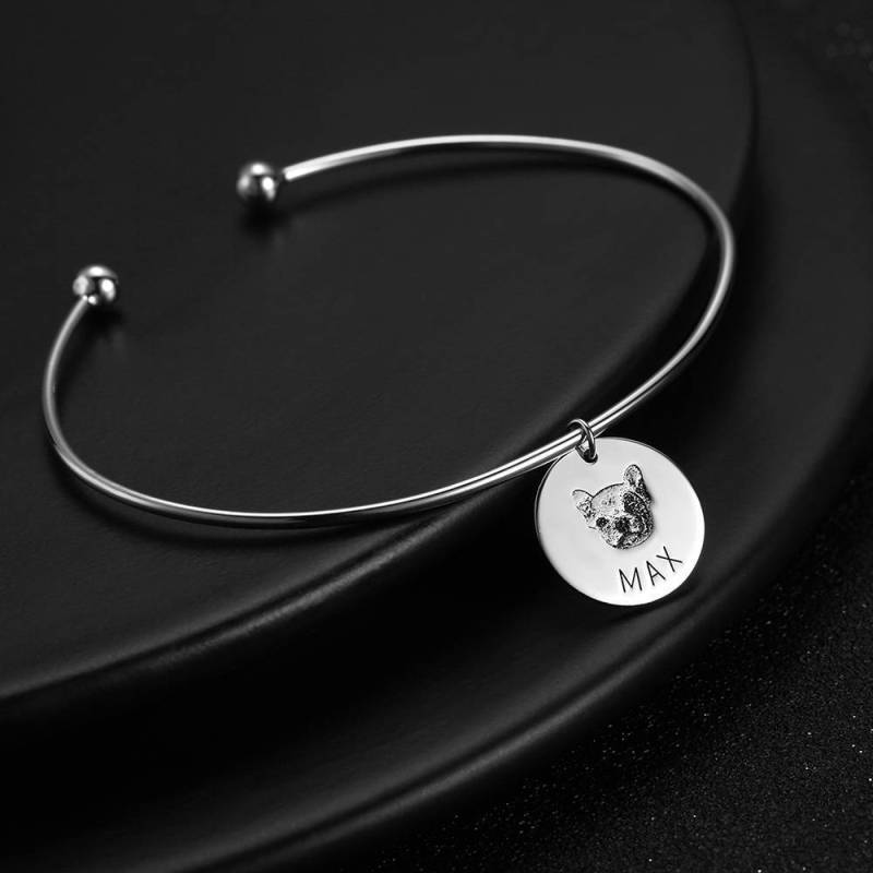 La pulsera con foto personalizada Soufeel es la manera perfecta de mantener tus mejores recuerdos cerca del alma. ?El regalo perfecto reflexivo, divertido y único para cualquier ocasión! ?El regalo perfecto, divertido y único para cualquier amante de las mascotas en cualquier ocasión! Vacaciones, cumplea?os, bodas o aniversarios: lo que sea, ?les ENCANTARá! Nuestros artistas cortarán, recortarán y colocarán su foto en una pulsera hermosa y atemporal. Esta pulsera de monedas es el regalo perfecto para los amantes de las mascotas. Cuenta con el retrato de su mascota junto con su nombre debajo. El dise?o delicado pero sorprendente lo hace perfecto para el uso diario. Es el regalo de cumplea?os perfecto o como pieza conmemorativa. Brazalete de Retrato de Foto con Forma Redonda con Grabado, Joyería de Retrato Personalizada Chapada en Oro Rosa.