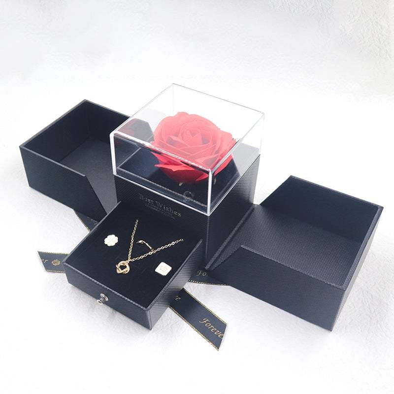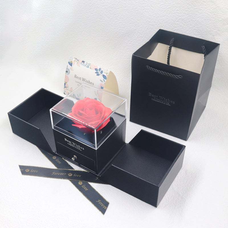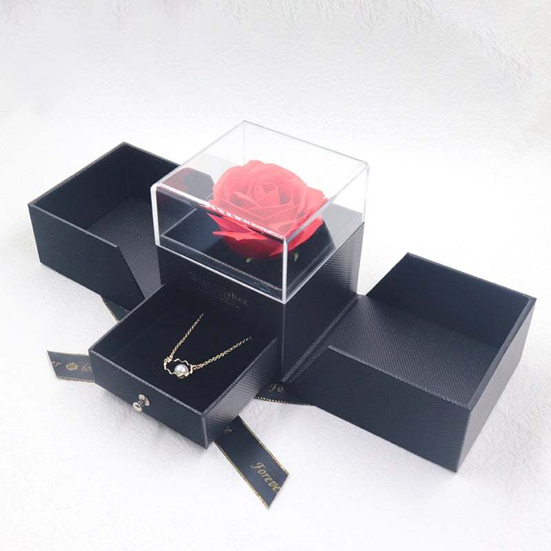El diseño de este joyero es una caja de regalo acrílica de doble puerta, que puede resaltar la nobleza y la elegancia del regalo. Hay cinco colores para elegir. El modelo de la caja es un joyero universal. Hay flores eternas en forma de rosas en la caja para que tu regalo esté más lleno de amor. Es adecuado para comprar un regalo en el día de San Valentín y envolverlo para tu amante.