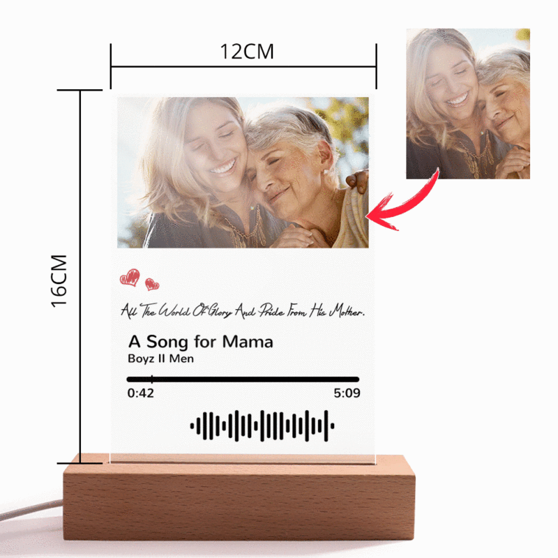 Esta lámpara acrílica única es el mejor regalo perfecto para él/ella en Navidad. Personalice la placa del código de música y un mismo llavero de código de música personalizado de forma gratuita. Puede elegir cualquier título de canción, nombre de artista y fotos favoritas que desee, todo puede imprimirse en la placa acrílica y puede generar un código de música único. Tenga en cuenta que la placa acrílica en sí no emite música. Tienes que escanear el código en la aplicación Música, después de escanear el código en Música, tu canción comenzará a reproducirse inmediatamente. En Navidad, creo que este es el regalo más romántico, toca la música más hermosa para tu amor.