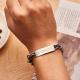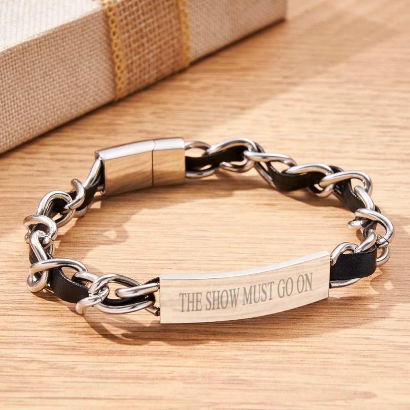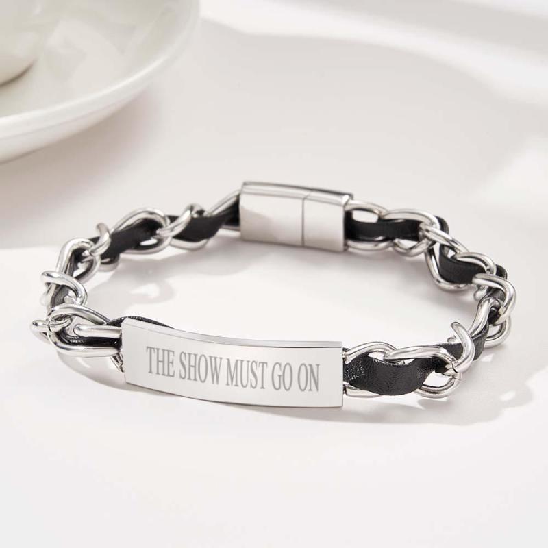 Descubra el epítome de la elegancia con nuestra exquisita pulsera de cadena de plata y placa de identificación de cuero. Elaborada con una combinación de cadena de acero inoxidable y cuerda de cuero negro, esta pulsera irradia sofisticación. Personalízalo con tu texto preferido, convirtiéndolo en un regalo atento y personalizado para papá en el Día del Padre.