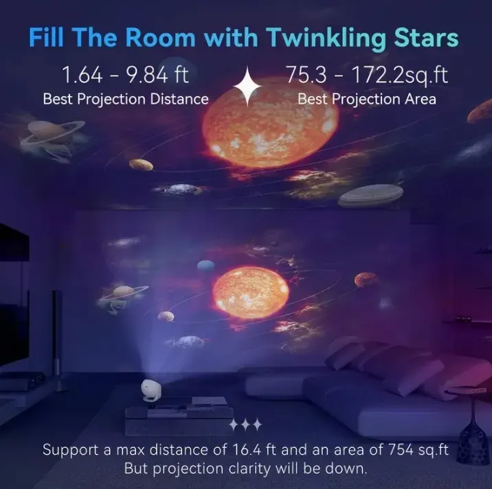 El área de proyección de 12,5 metros cuadrados se puede adaptar a diferentes alturas del suelo y el cielo está lleno de estrellas en toda la sala.