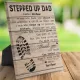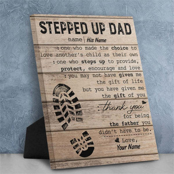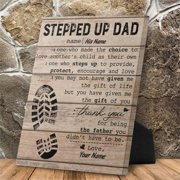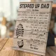¡Un regalo de agradecimiento para todos los Stepped Up Dads! Un cartel de regalo personalizado para padrastros con una huella de zapato y un arte mural con fondo de madera con un mensaje de agradecimiento con el nombre del niño.
