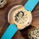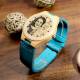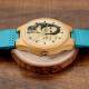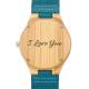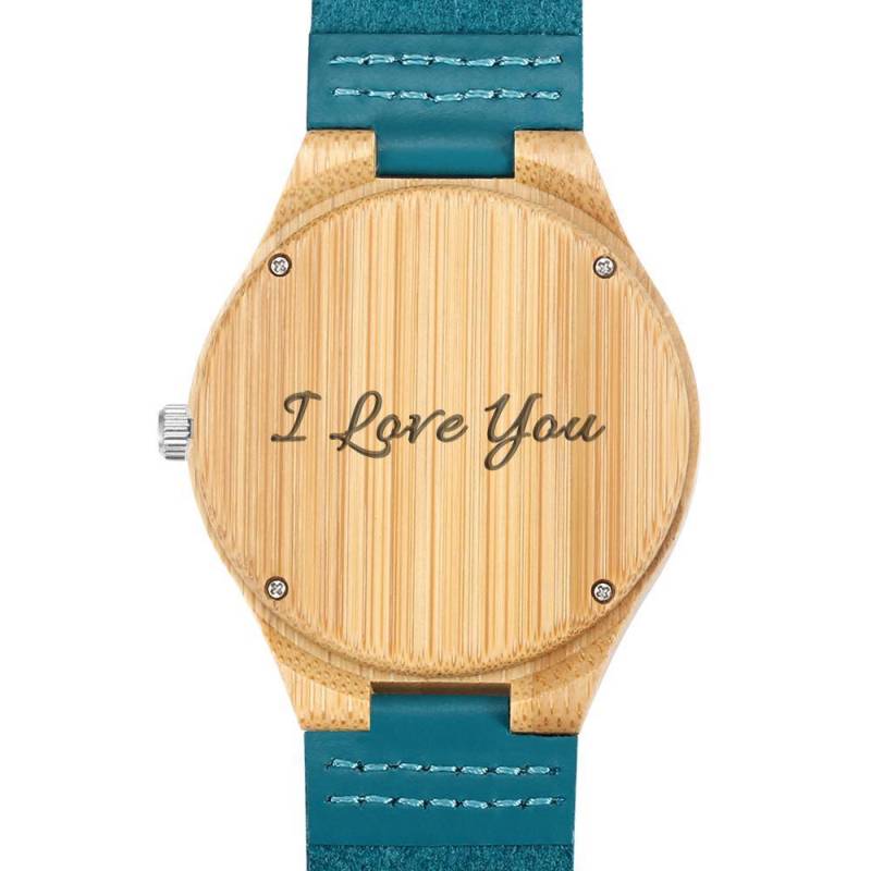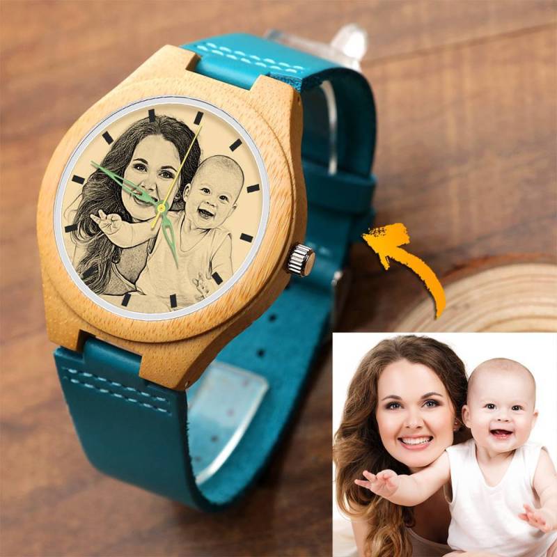 Mujer Reloj Grabable de Madera con Foto con Pulsera de Cuero Azul - Bambú