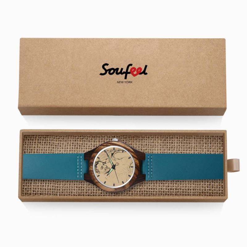 Mujer Reloj Grabable de Madera con Foto con Pulsera de Cuero Azul - Sándalo