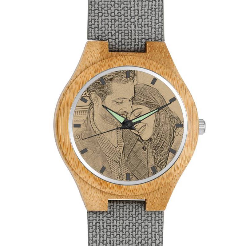 Femenino Bambú Reloj Grabable de Foto Correa de Cuero Gris 40mm