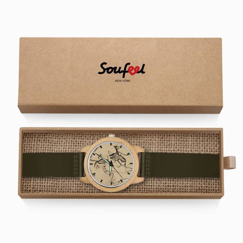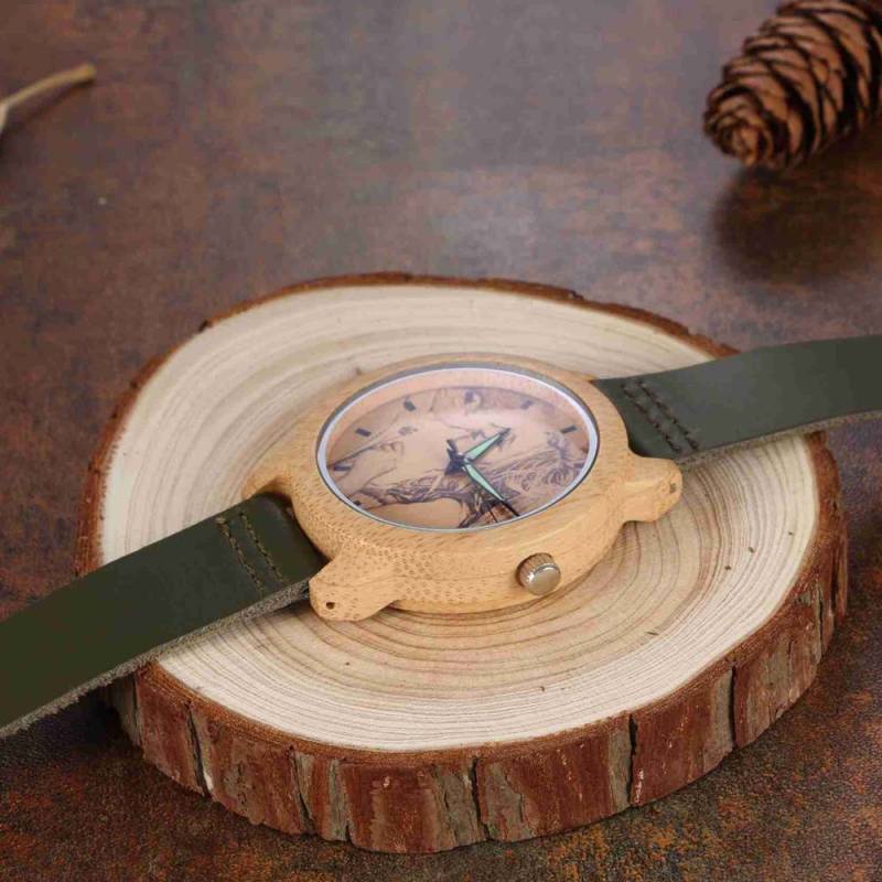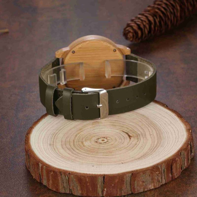 Femenino Grabable Bambú Reloj de Foto Correa de Cuero Verde Oscuro 40mm